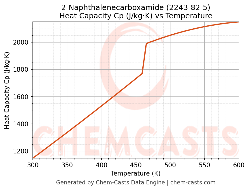 - Specific heat capacity (Cp) indicates the amount of energy required to raise the temperature of 2-Naphthalenecarboxamide and is critical for energy balance and heat-exchanger design.