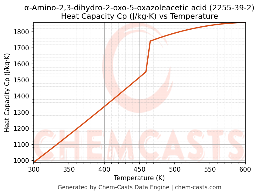 This page presents the temperature-dependent thermodynamic and transport properties of α-Amino-2,3-dihydro-2-oxo-5-oxazoleacetic acid (CAS 2255-39-2) calculated at a constant pressure of 1 atm (101325 Pa) over the temperature range 250-500 K.