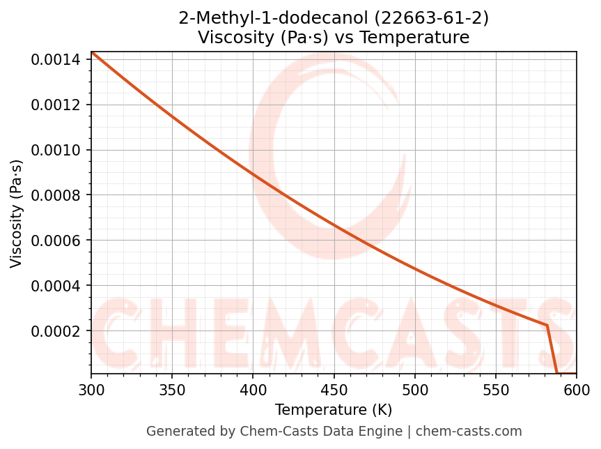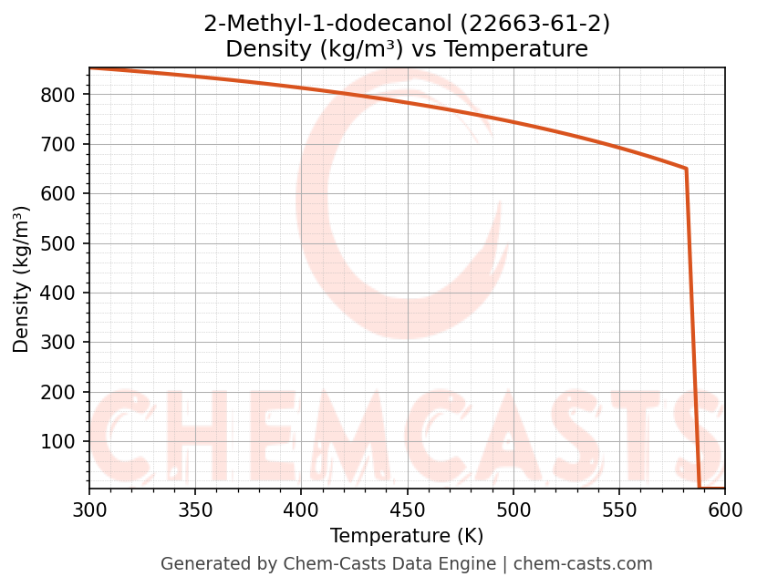 This page presents the temperature-dependent thermodynamic and transport properties of 2-Methyl-1-dodecanol (CAS 22663-61-2) calculated at a constant pressure of 1 atm (101325 Pa) over the temperature range 250-500 K.