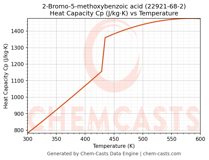 - Specific heat capacity (Cp) indicates the amount of energy required to raise the temperature of 2-Bromo-5-methoxybenzoic acid and is critical for energy balance and heat-exchanger design.
