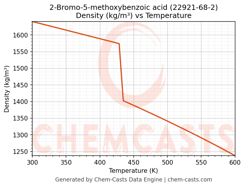 This page presents the temperature-dependent thermodynamic and transport properties of 2-Bromo-5-methoxybenzoic acid (CAS 22921-68-2) calculated at a constant pressure of 1 atm (101325 Pa) over the temperature range 250-500 K.