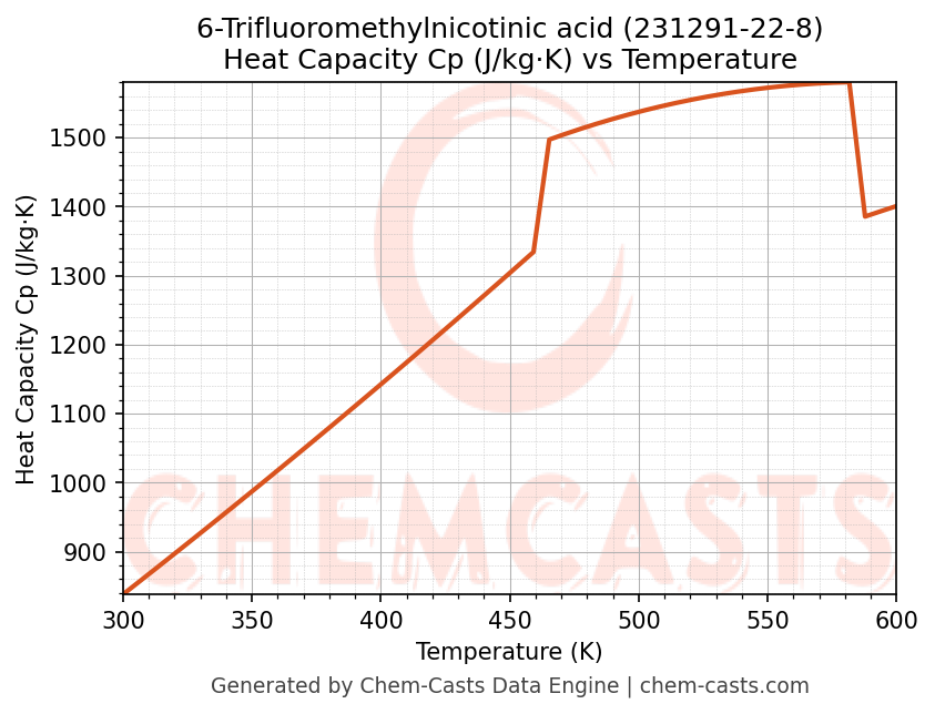 - Specific heat capacity (Cp) indicates the amount of energy required to raise the temperature of 6-Trifluoromethylnicotinic acid and is critical for energy balance and heat-exchanger design.