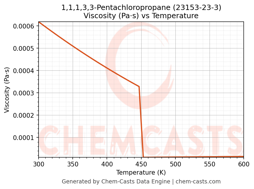 This page presents the temperature-dependent thermodynamic and transport properties of 1,1,1,3,3-Pentachloropropane (CAS 23153-23-3) calculated at a constant pressure of 1 atm (101325 Pa) over the temperature range 250-500 K.