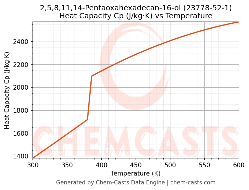 - Specific heat capacity (Cp) indicates the amount of energy required to raise the temperature of 2,5,8,11,14-Pentaoxahexadecan-16-ol and is critical for energy balance and heat-exchanger design.