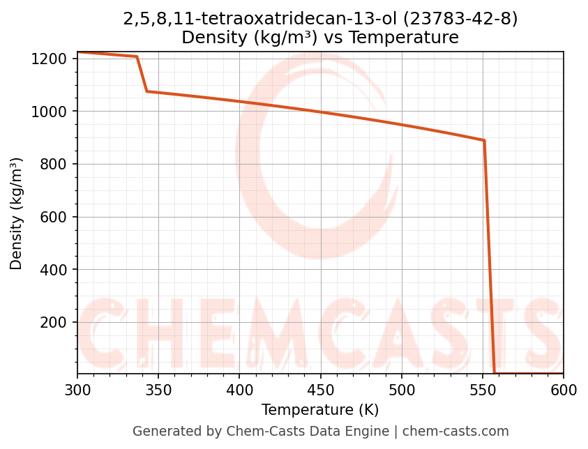 This page presents the temperature-dependent thermodynamic and transport properties of 2,5,8,11-tetraoxatridecan-13-ol (CAS 23783-42-8) calculated at a constant pressure of 1 atm (101325 Pa) over the temperature range 250-500 K.