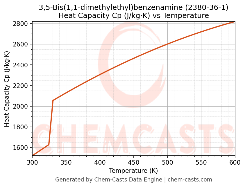 - Specific heat capacity (Cp) indicates the amount of energy required to raise the temperature of 3,5-Bis(1,1-dimethylethyl)benzenamine and is critical for energy balance and heat-exchanger design.
