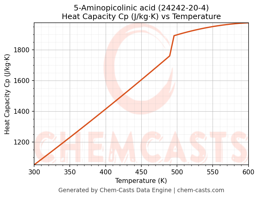 - Specific heat capacity (Cp) indicates the amount of energy required to raise the temperature of 5-Aminopicolinic acid and is critical for energy balance and heat-exchanger design.