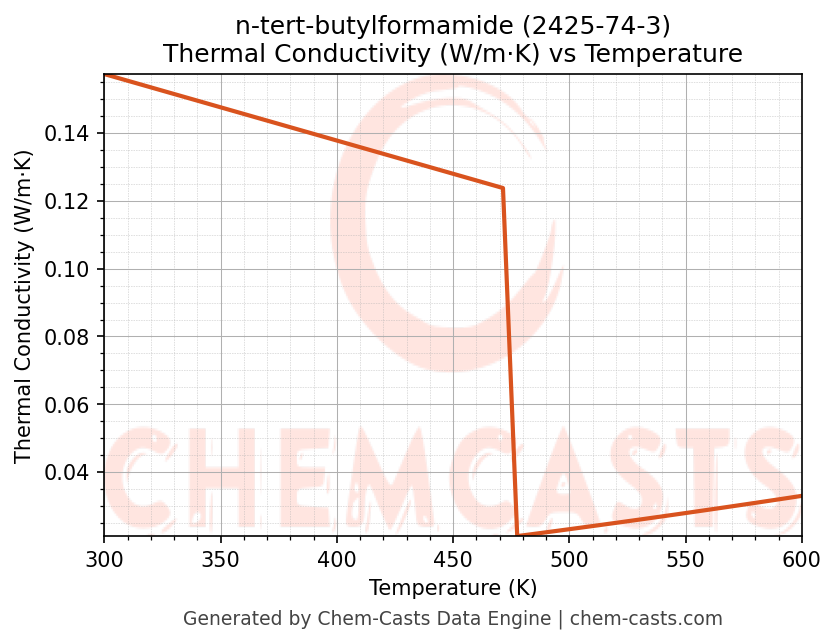 This page presents the temperature-dependent thermodynamic and transport properties of n-tert-butylformamide (CAS 2425-74-3) calculated at a constant pressure of 1 atm (101325 Pa) over the temperature range 250-500 K.