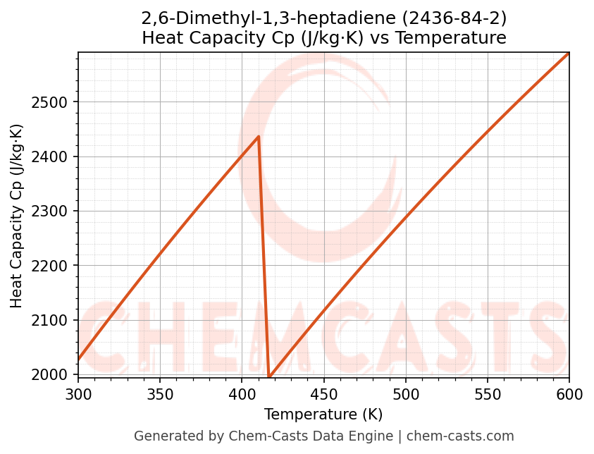 - Specific heat capacity (Cp) indicates the amount of energy required to raise the temperature of 2,6-Dimethyl-1,3-heptadiene and is critical for energy balance and heat-exchanger design.