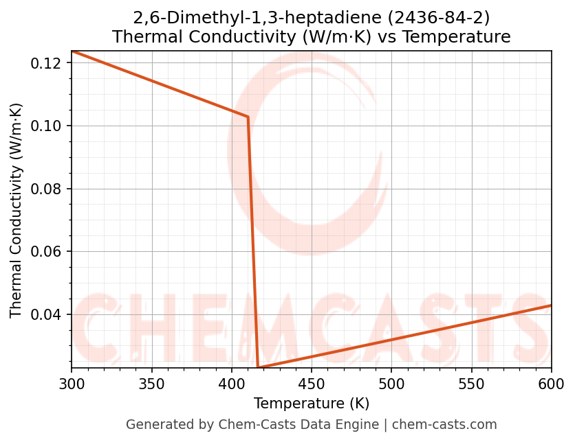 This page presents the temperature-dependent thermodynamic and transport properties of 2,6-Dimethyl-1,3-heptadiene (CAS 2436-84-2) calculated at a constant pressure of 1 atm (101325 Pa) over the temperature range 250-500 K.