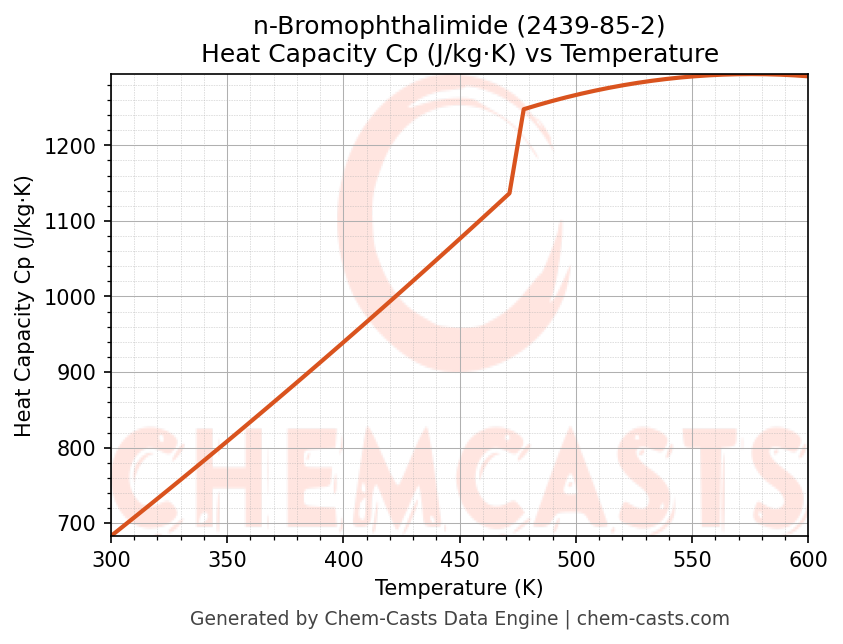 - Specific heat capacity (Cp) indicates the amount of energy required to raise the temperature of n-Bromophthalimide and is critical for energy balance and heat-exchanger design.