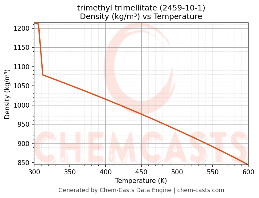 This page presents the temperature-dependent thermodynamic and transport properties of trimethyl trimellitate (CAS 2459-10-1) calculated at a constant pressure of 1 atm (101325 Pa) over the temperature range 250-500 K.