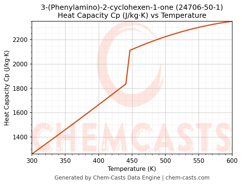 - Specific heat capacity (Cp) indicates the amount of energy required to raise the temperature of 3-(Phenylamino)-2-cyclohexen-1-one and is critical for energy balance and heat-exchanger design.