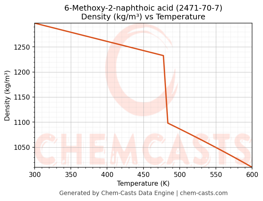 This page presents the temperature-dependent thermodynamic and transport properties of 6-Methoxy-2-naphthoic acid (CAS 2471-70-7) calculated at a constant pressure of 1 atm (101325 Pa) over the temperature range 250-500 K.