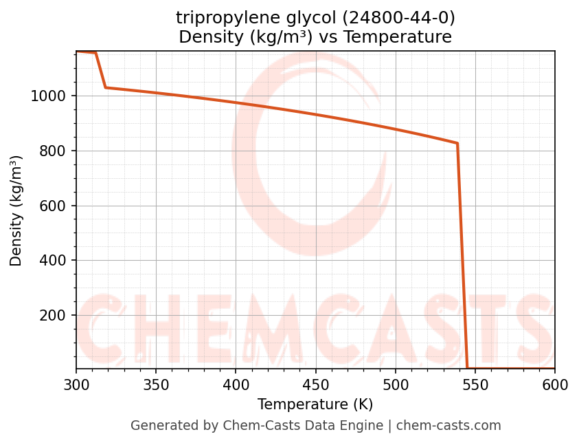 - Specific heat capacity (Cp) indicates the amount of energy required to raise the temperature of tripropylene glycol and is critical for energy balance and heat-exchanger design.