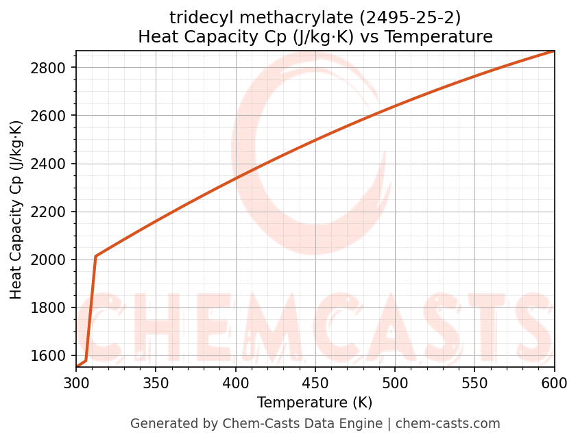 - Specific heat capacity (Cp) indicates the amount of energy required to raise the temperature of tridecyl methacrylate and is critical for energy balance and heat-exchanger design.
