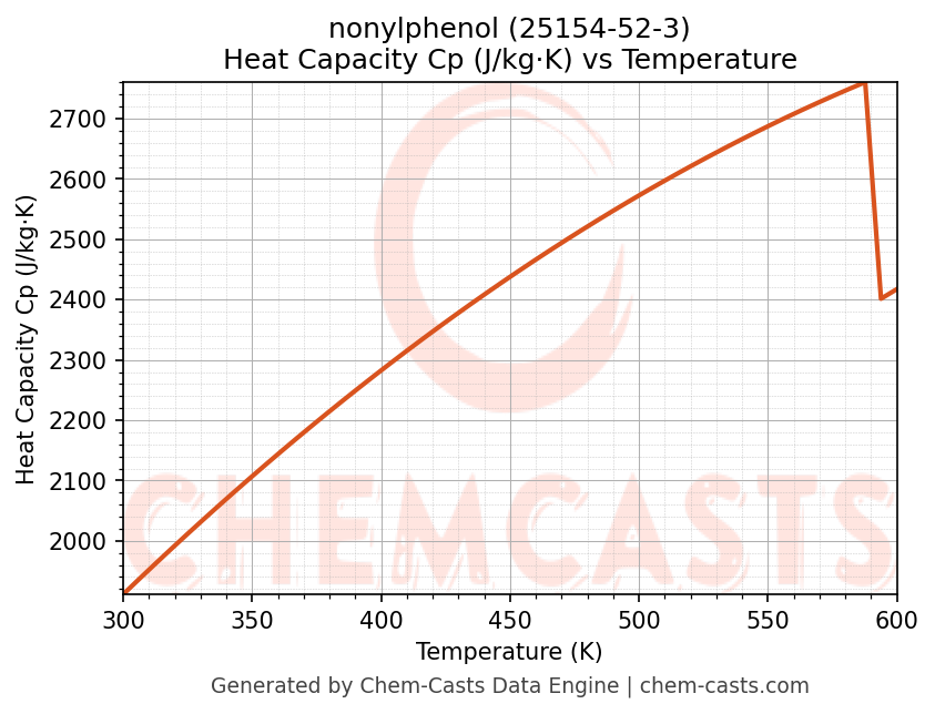 - Specific heat capacity (Cp) indicates the amount of energy required to raise the temperature of nonylphenol and is critical for energy balance and heat-exchanger design.