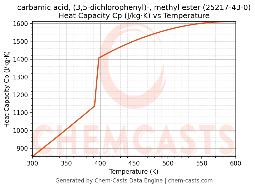 - Specific heat capacity (Cp) indicates the amount of energy required to raise the temperature of carbamic acid, (3,5-dichlorophenyl)-, methyl ester and is critical for energy balance and heat-exchanger design.
