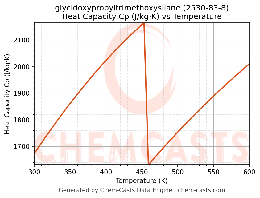 - Specific heat capacity (Cp) indicates the amount of energy required to raise the temperature of glycidoxypropyltrimethoxysilane and is critical for energy balance and heat-exchanger design.