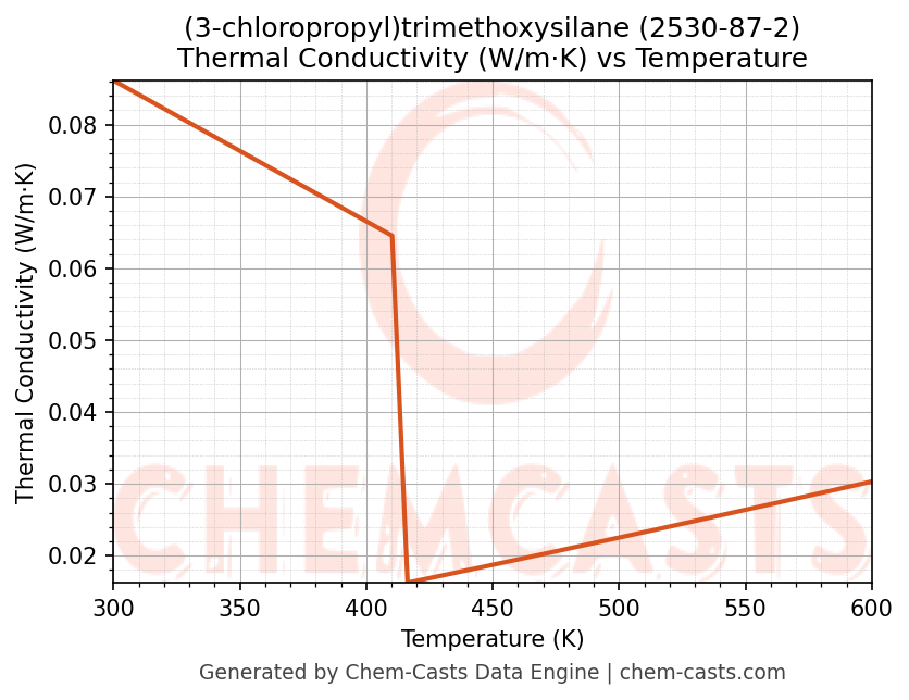 This page presents the temperature-dependent thermodynamic and transport properties of (3-chloropropyl)trimethoxysilane (CAS 2530-87-2) calculated at a constant pressure of 1 atm (101325 Pa) over the temperature range 250-500 K.