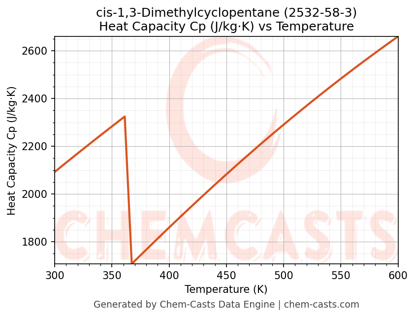 - Specific heat capacity (Cp) indicates the amount of energy required to raise the temperature of cis-1,3-Dimethylcyclopentane and is critical for energy balance and heat-exchanger design.