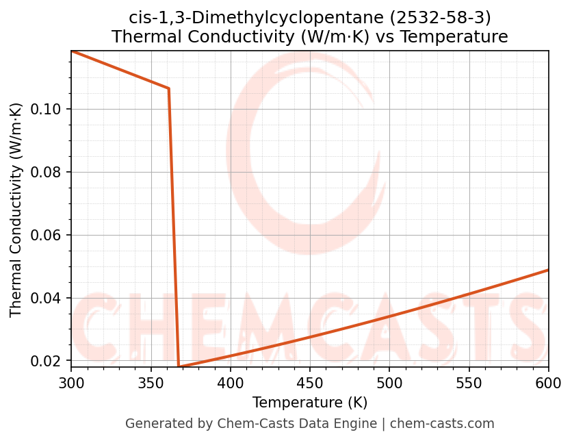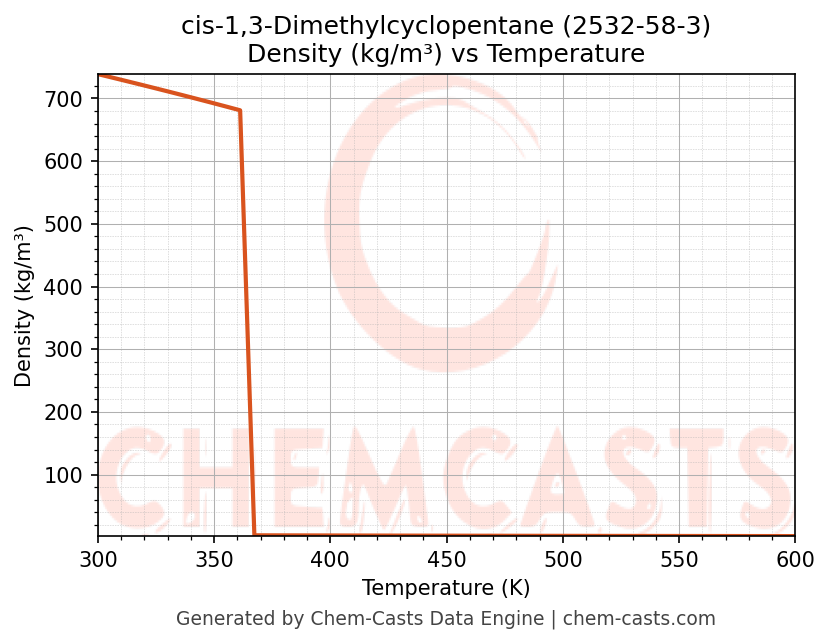 This page presents the temperature-dependent thermodynamic and transport properties of cis-1,3-Dimethylcyclopentane (CAS 2532-58-3) calculated at a constant pressure of 1 atm (101325 Pa) over the temperature range 250-500 K.