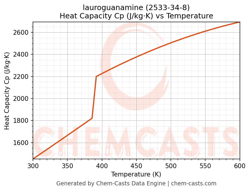 This page presents the temperature-dependent thermodynamic and transport properties of lauroguanamine (CAS 2533-34-8) calculated at a constant pressure of 1 atm (101325 Pa) over the temperature range 250-500 K.