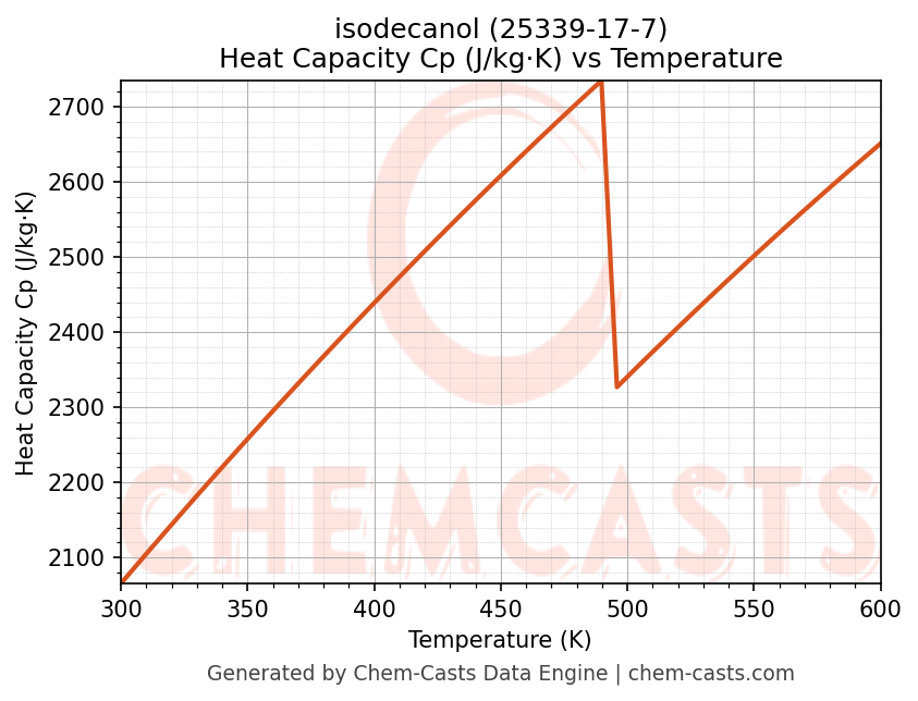 - Specific heat capacity (Cp) indicates the amount of energy required to raise the temperature of isodecanol and is critical for energy balance and heat-exchanger design.