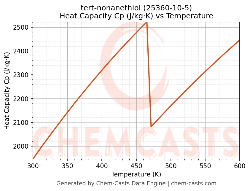 - Specific heat capacity (Cp) indicates the amount of energy required to raise the temperature of tert-nonanethiol and is critical for energy balance and heat-exchanger design.