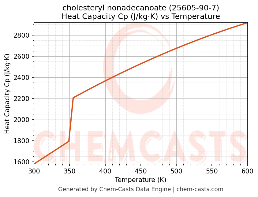 - Specific heat capacity (Cp) indicates the amount of energy required to raise the temperature of cholesteryl nonadecanoate and is critical for energy balance and heat-exchanger design.