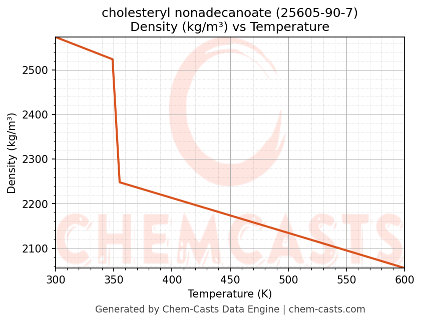 This page presents the temperature-dependent thermodynamic and transport properties of cholesteryl nonadecanoate (CAS 25605-90-7) calculated at a constant pressure of 1 atm (101325 Pa) over the temperature range 250-500 K.