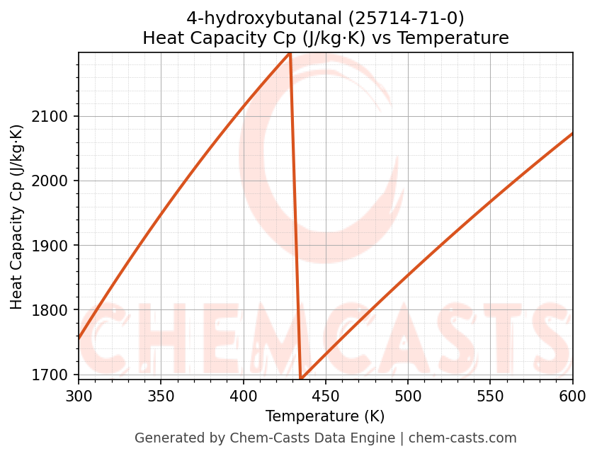- Specific heat capacity (Cp) indicates the amount of energy required to raise the temperature of 4-hydroxybutanal and is critical for energy balance and heat-exchanger design.