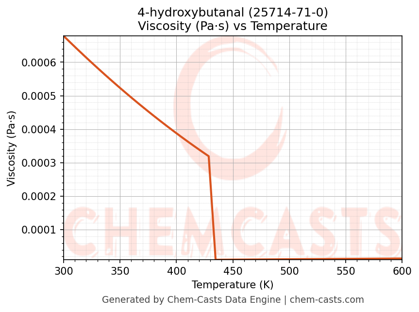 This page presents the temperature-dependent thermodynamic and transport properties of 4-hydroxybutanal (CAS 25714-71-0) calculated at a constant pressure of 1 atm (101325 Pa) over the temperature range 250-500 K.