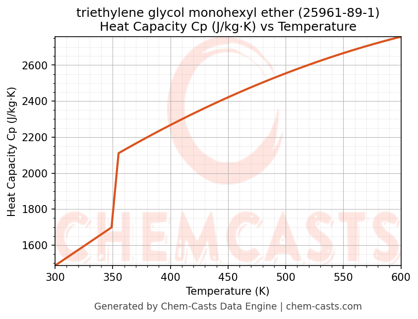 - Specific heat capacity (Cp) indicates the amount of energy required to raise the temperature of triethylene glycol monohexyl ether and is critical for energy balance and heat-exchanger design.