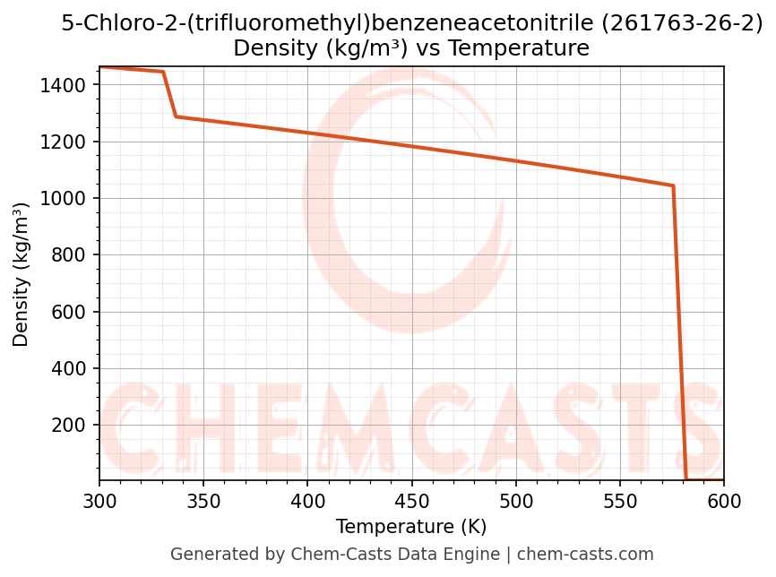 This page presents the temperature-dependent thermodynamic and transport properties of 5-Chloro-2-(trifluoromethyl)benzeneacetonitrile (CAS 261763-26-2) calculated at a constant pressure of 1 atm (101325 Pa) over the temperature range 250-500 K.