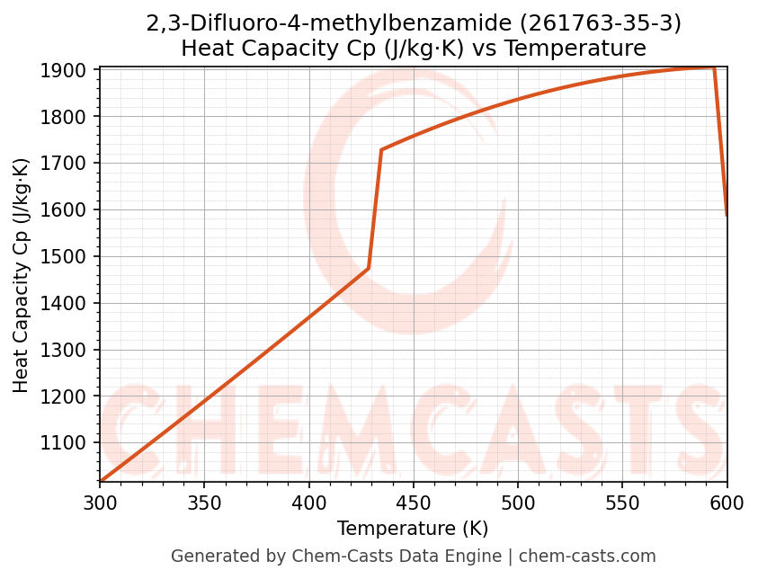 - Specific heat capacity (Cp) indicates the amount of energy required to raise the temperature of 2,3-Difluoro-4-methylbenzamide and is critical for energy balance and heat-exchanger design.