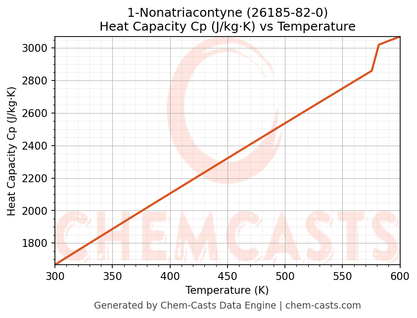- Specific heat capacity (Cp) indicates the amount of energy required to raise the temperature of 1-Nonatriacontyne and is critical for energy balance and heat-exchanger design.