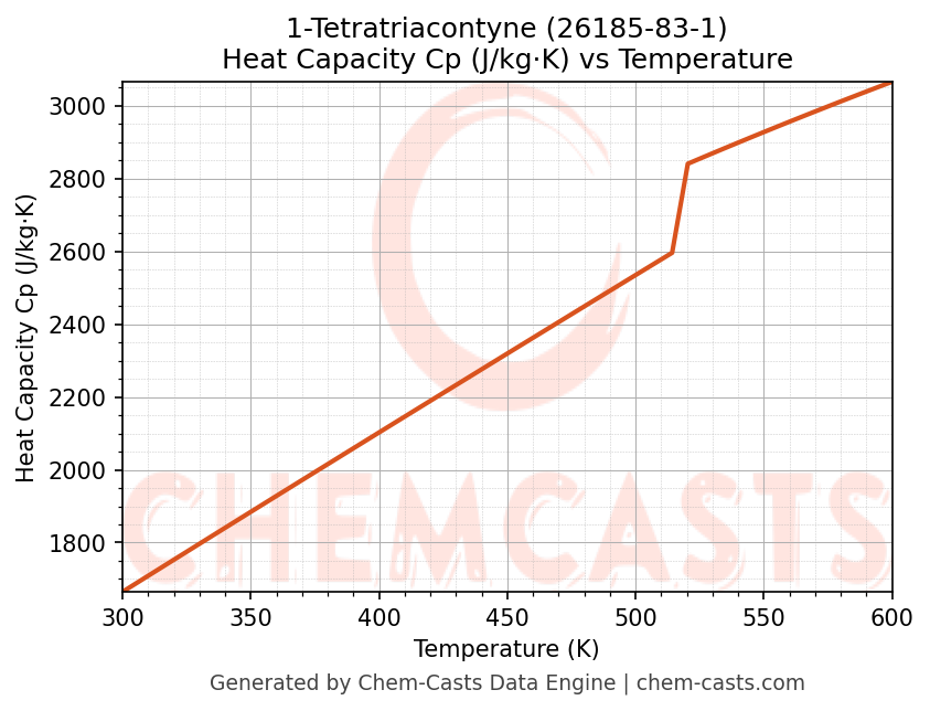 - Specific heat capacity (Cp) indicates the amount of energy required to raise the temperature of 1-Tetratriacontyne and is critical for energy balance and heat-exchanger design.