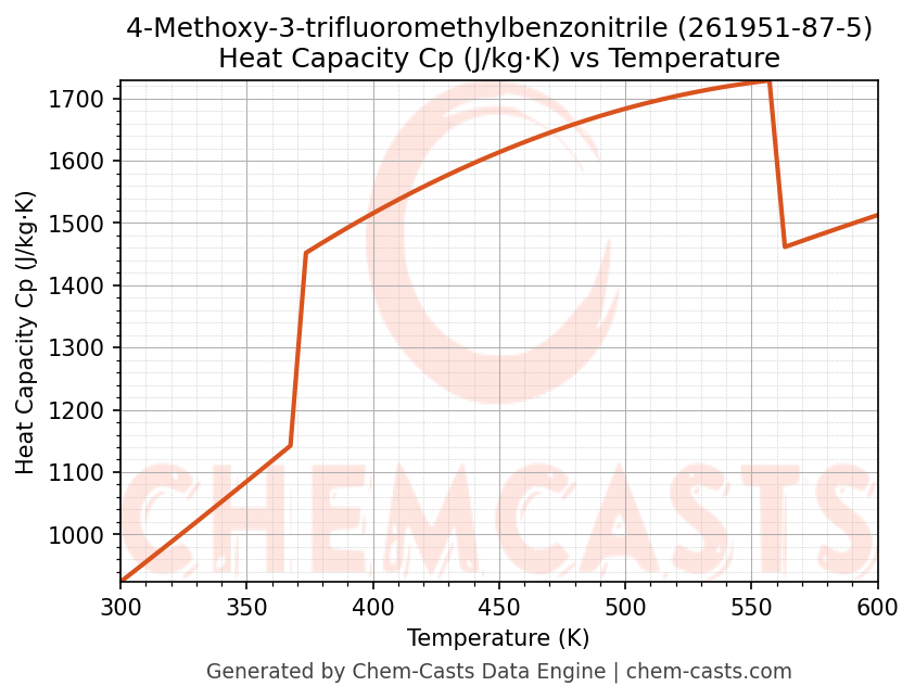 - Specific heat capacity (Cp) indicates the amount of energy required to raise the temperature of 4-Methoxy-3-trifluoromethylbenzonitrile and is critical for energy balance and heat-exchanger design.