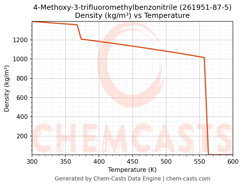 This page presents the temperature-dependent thermodynamic and transport properties of 4-Methoxy-3-trifluoromethylbenzonitrile (CAS 261951-87-5) calculated at a constant pressure of 1 atm (101325 Pa) over the temperature range 250-500 K.