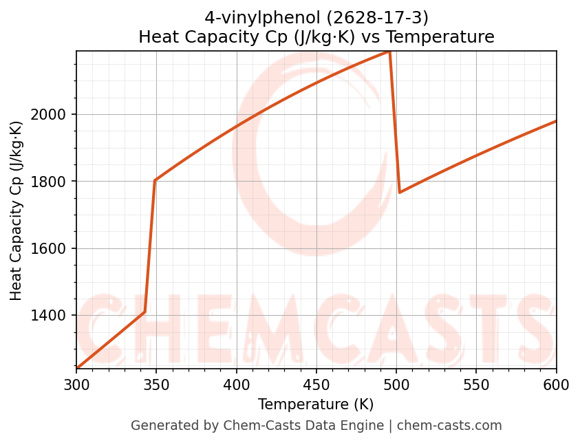 - Specific heat capacity (Cp) indicates the amount of energy required to raise the temperature of 4-vinylphenol and is critical for energy balance and heat-exchanger design.