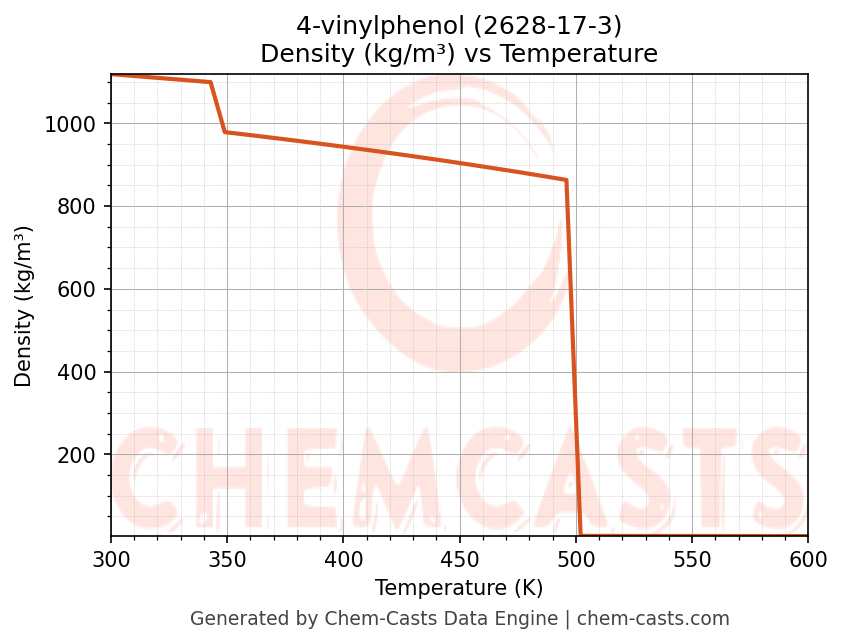 This page presents the temperature-dependent thermodynamic and transport properties of 4-vinylphenol (CAS 2628-17-3) calculated at a constant pressure of 1 atm (101325 Pa) over the temperature range 250-500 K.