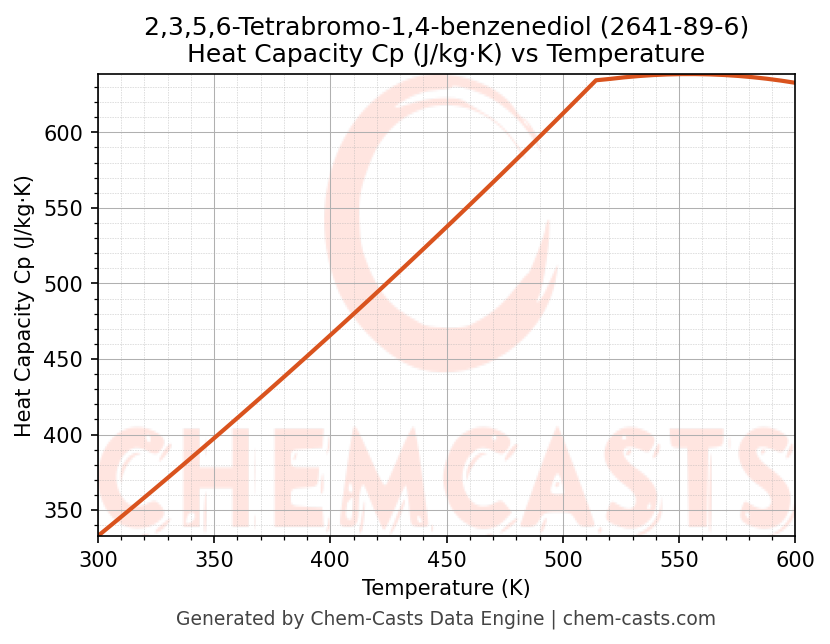 - Specific heat capacity (Cp) indicates the amount of energy required to raise the temperature of 2,3,5,6-Tetrabromo-1,4-benzenediol and is critical for energy balance and heat-exchanger design.