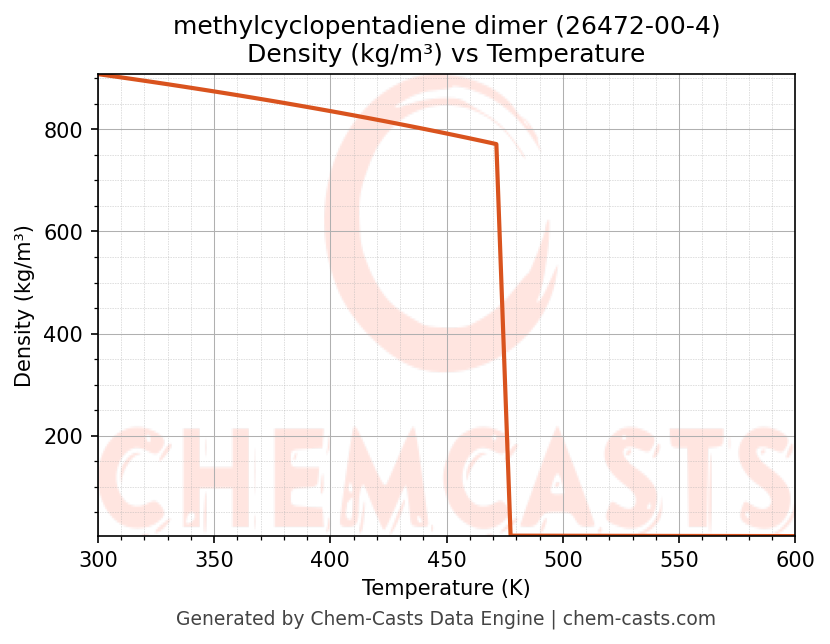 This page presents the temperature-dependent thermodynamic and transport properties of methylcyclopentadiene dimer (CAS 26472-00-4) calculated at a constant pressure of 1 atm (101325 Pa) over the temperature range 250-500 K.