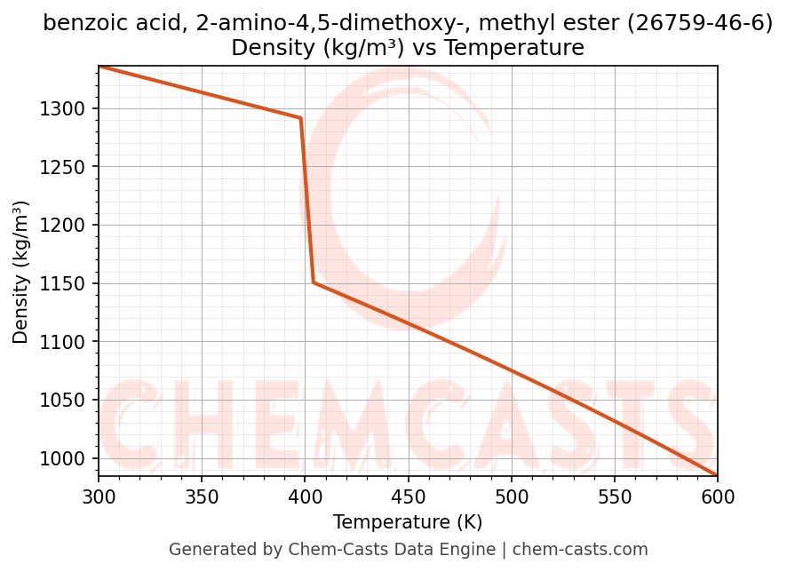 - Specific heat capacity (Cp) indicates the amount of energy required to raise the temperature of benzoic acid, 2-amino-4,5-dimethoxy-, methyl ester and is critical for energy balance and heat-exchanger design.