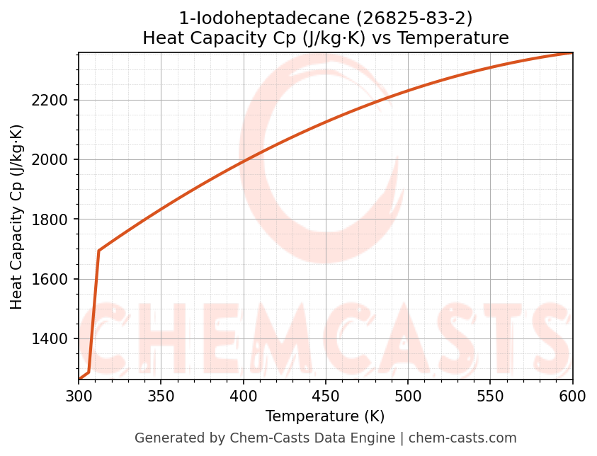 - Specific heat capacity (Cp) indicates the amount of energy required to raise the temperature of 1-Iodoheptadecane and is critical for energy balance and heat-exchanger design.
