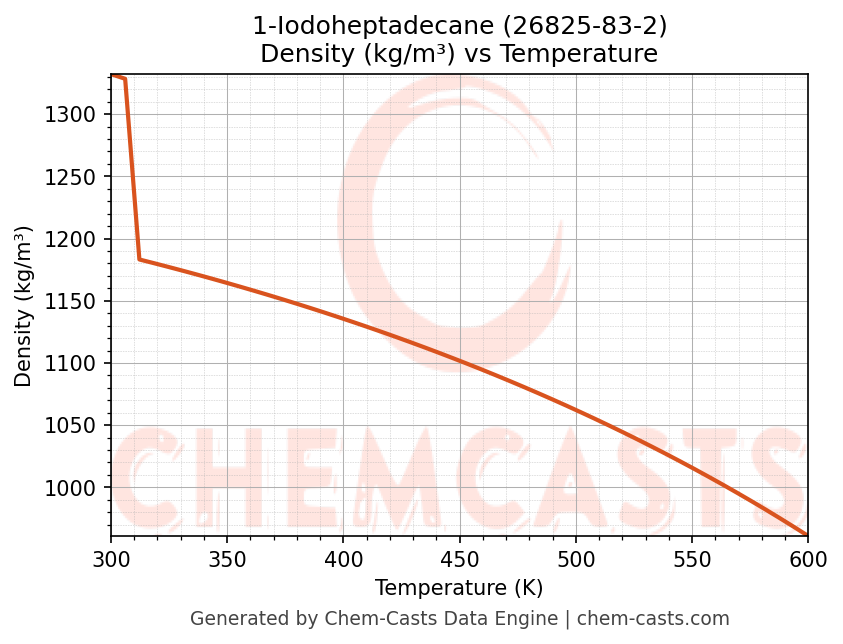 This page presents the temperature-dependent thermodynamic and transport properties of 1-Iodoheptadecane (CAS 26825-83-2) calculated at a constant pressure of 1 atm (101325 Pa) over the temperature range 250-500 K.