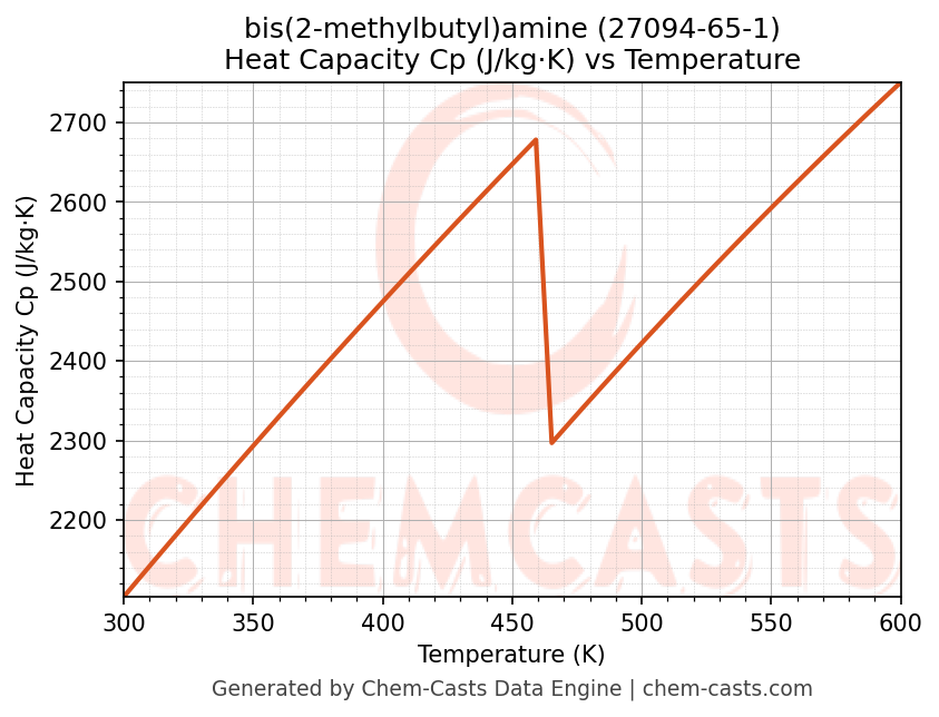 - Specific heat capacity (Cp) indicates the amount of energy required to raise the temperature of bis(2-methylbutyl)amine and is critical for energy balance and heat-exchanger design.