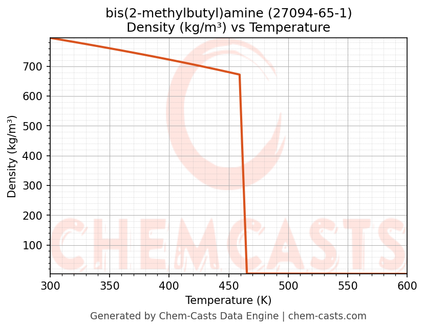 This page presents the temperature-dependent thermodynamic and transport properties of bis(2-methylbutyl)amine (CAS 27094-65-1) calculated at a constant pressure of 1 atm (101325 Pa) over the temperature range 250-500 K.