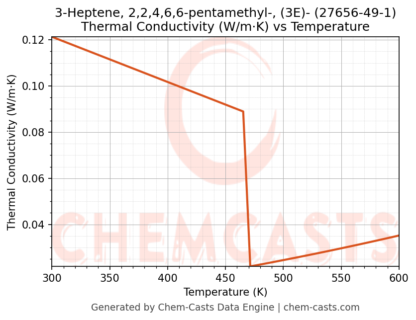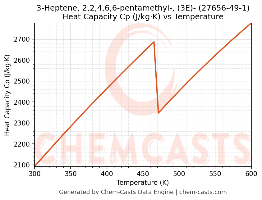 - Specific heat capacity (Cp) indicates the amount of energy required to raise the temperature of 3-Heptene, 2,2,4,6,6-pentamethyl-, (3E)- and is critical for energy balance and heat-exchanger design.